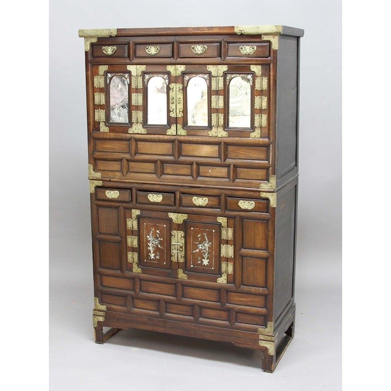 possibly Korean or Japanese, late 19th or 20th century, hardwood veneered with metal mounts, in two sections, teh top with four drawers and a pair of mirrored bi-fold doors, the base with four drawers and a pair of mother of pearl inlaid doors, height 151cm, width 94cm, depth 45cm