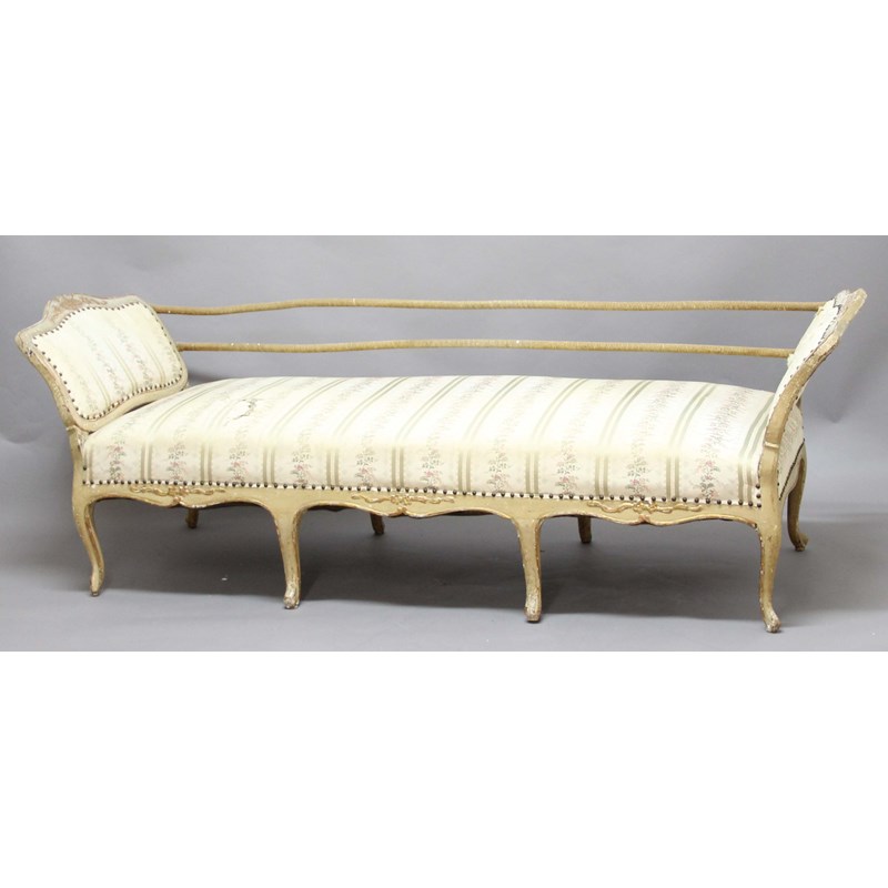 FRENCH PAINTED DAY BED, probably 18th century, the serpentine bed and ends with carved, scrolling, painted and parcel gilt frame on eight, slight cabriole legs, height 72cm, width 210cm, depth 70cm