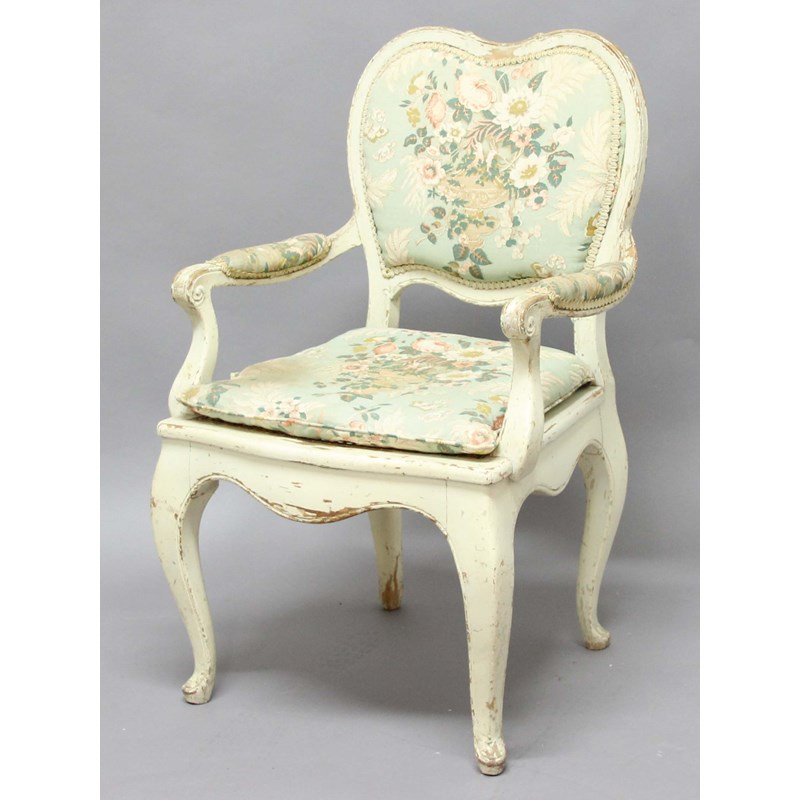 FRENCH PAINTED ELBOW CHAIR, 19th century, with scrolling arms, caned seat and cabriole legs, height 97cm