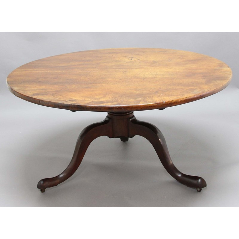 GEORGE III MAHOGANY TILT TOP DINING TABLE, the circular top on a short turned column and scrolling tripod base, height 74cm, diameter 142cm