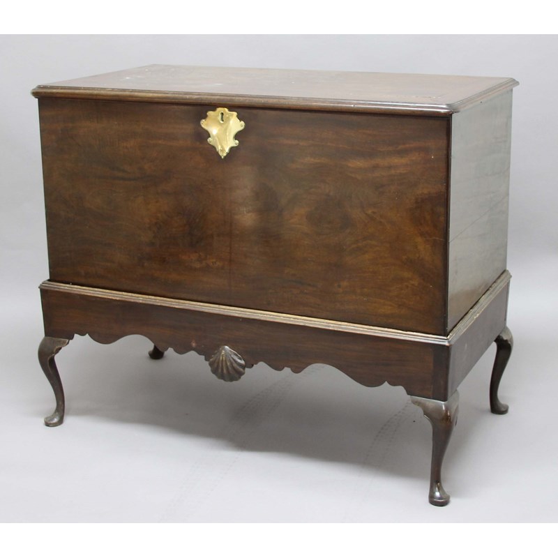 possibly Irish, with hinged cover, the base with a wavy apron and central shell motif, on short cabriole legs, paper Miller and Beatty, Grafton Street, Dublin label to the base, height 104cm, width 126cm, depth 65cm