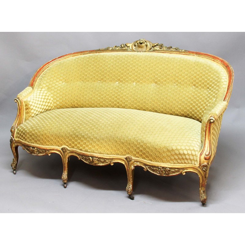 the back rail with foliate and flower bud carving above a buttoned back, upholstered arms and stuffed over serpentine seat, the apron with floral carving above cabriole legs with stiff leave decoration, height 95cm, width 170cm, depth 95cm