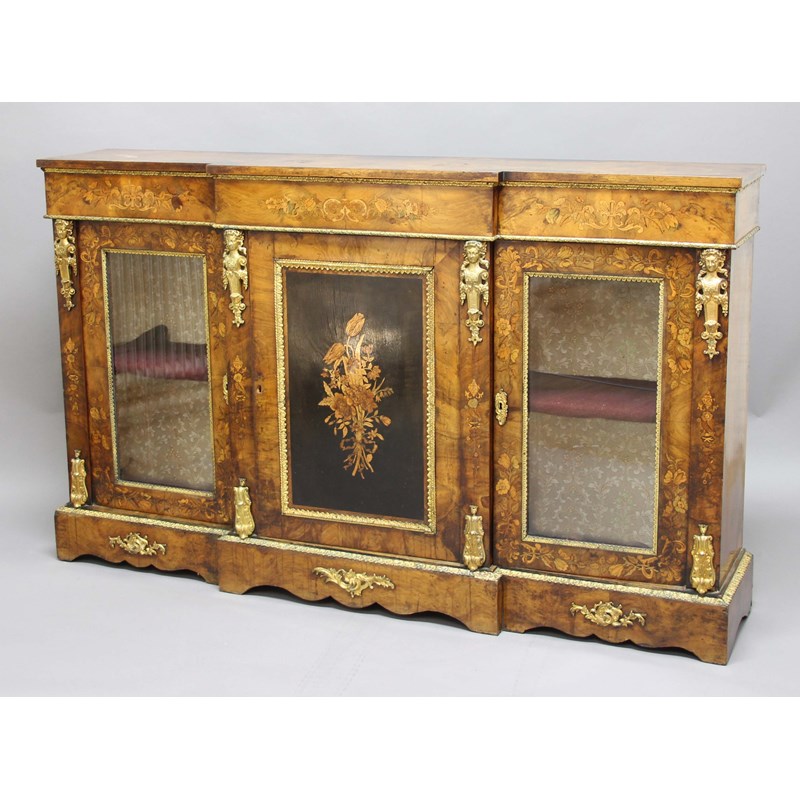 VICTORIAN BURR WALNUT AND INLAID BREAKFRONT CREDENZA,