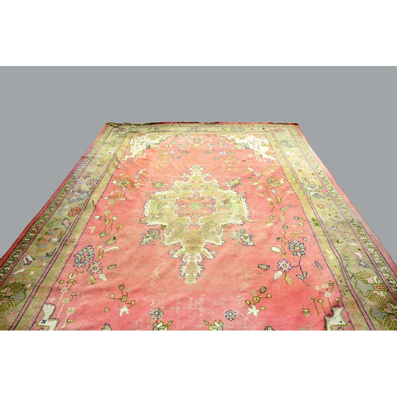 the pale candy pink field sparsely decorated with angular vines around a medallion, framed by stepped ivory spandrils and wide borders of stylised flowerheads flanked by meandering vine guard stripes, 680cm x 400cm approximately