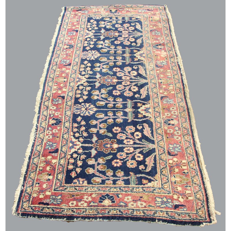 the indigo field with a one way design of semi naturalistic plants enclosed by raspberry borders, 220cm x 100cm. Together with a Tekke Turkmen rug (2)