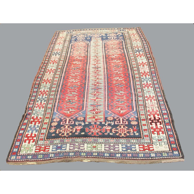 KAZAK RUG, circa 1900, of Megri design, a pair of red ground panels flanking a blue ground panel inside a geometric border, 220cm x 134cm approx