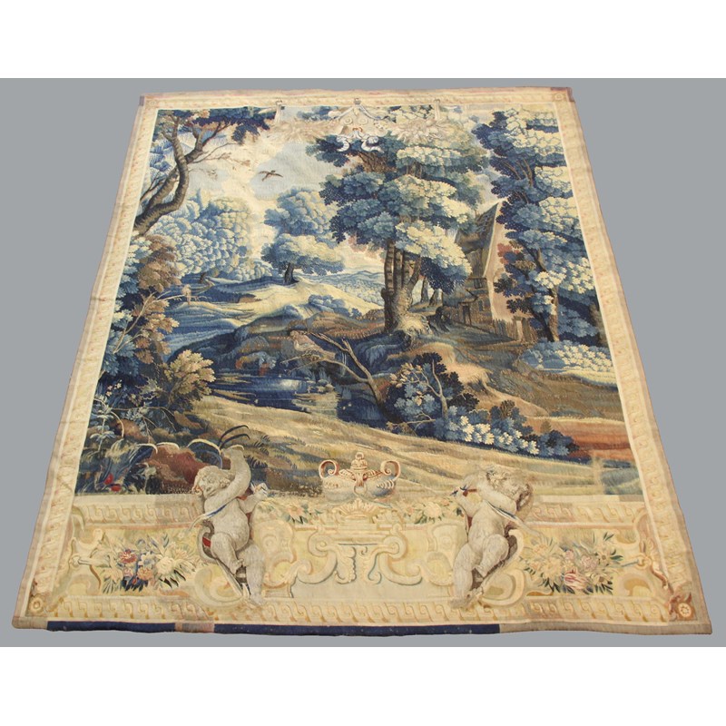 possibly late 17th century, the central field of a cottage in a woodland setting with a jay and other birds, the trompe l'oeil frame with swags of fruit and flowers to the top and two putti flanking an urn with garlands of flowers, 293cm x 242cm