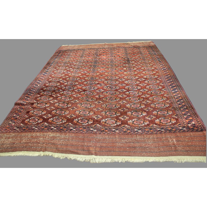 PART SILK SARYK TURKMEN MAIN CARPET, circa 1890, Turkmen/Afghan/Iranian frontier, six columns of quartered guls on an aubergine ground, approx 360cm x 260cm