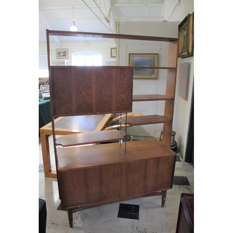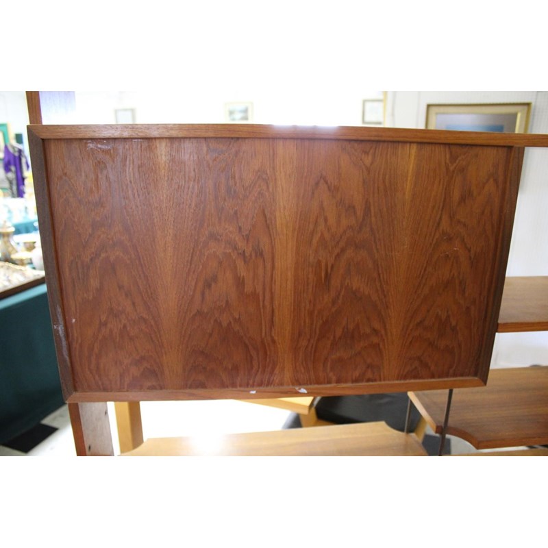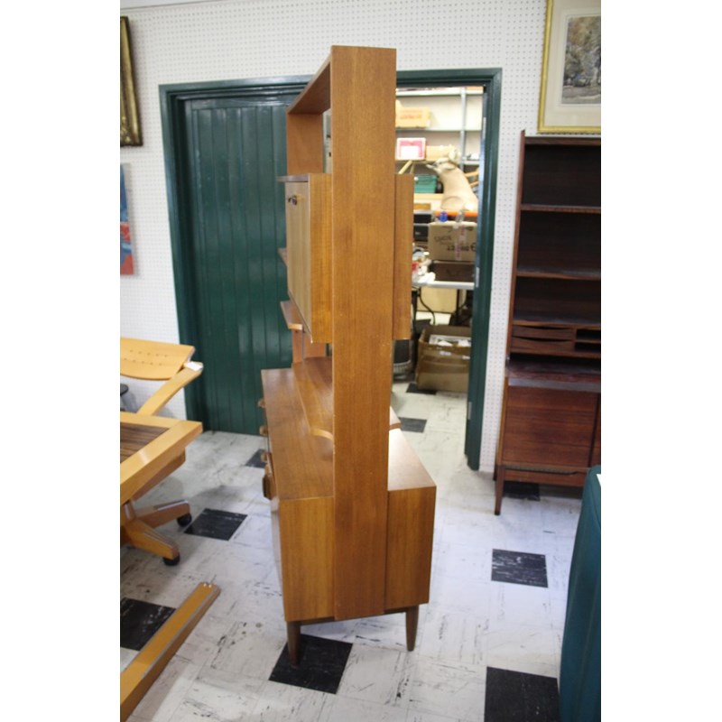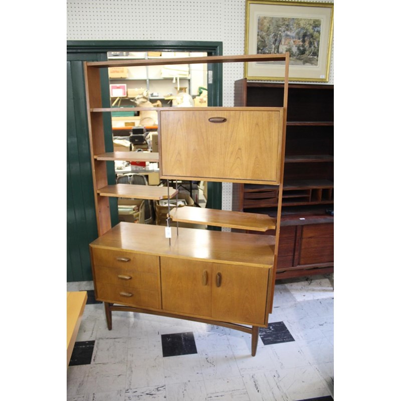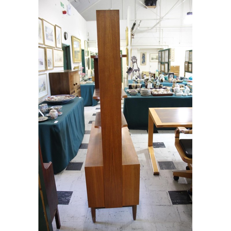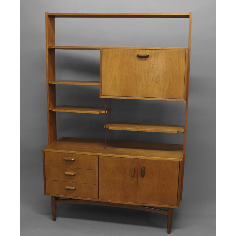 a large teak room divider, the top section with a drop down flap and glass shelf, and various shaped shelves supported on vertical metal supports. The bottom section with a two door cupboard and three drawers, supported on turned legs and cross stretcher. 182cms high, 122cms across