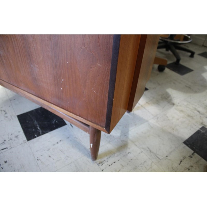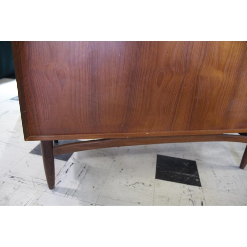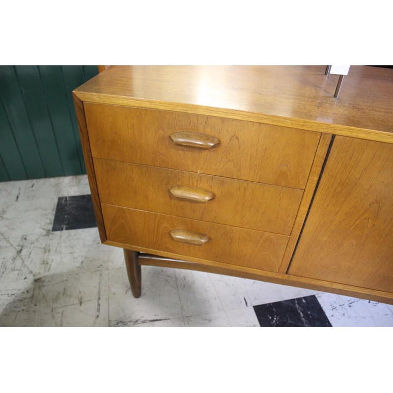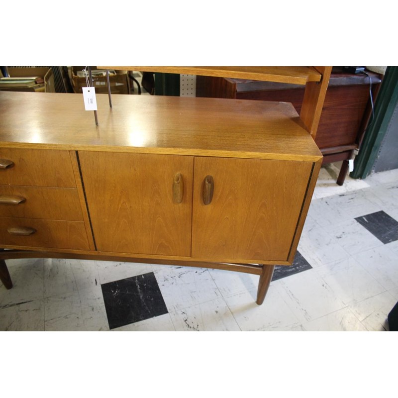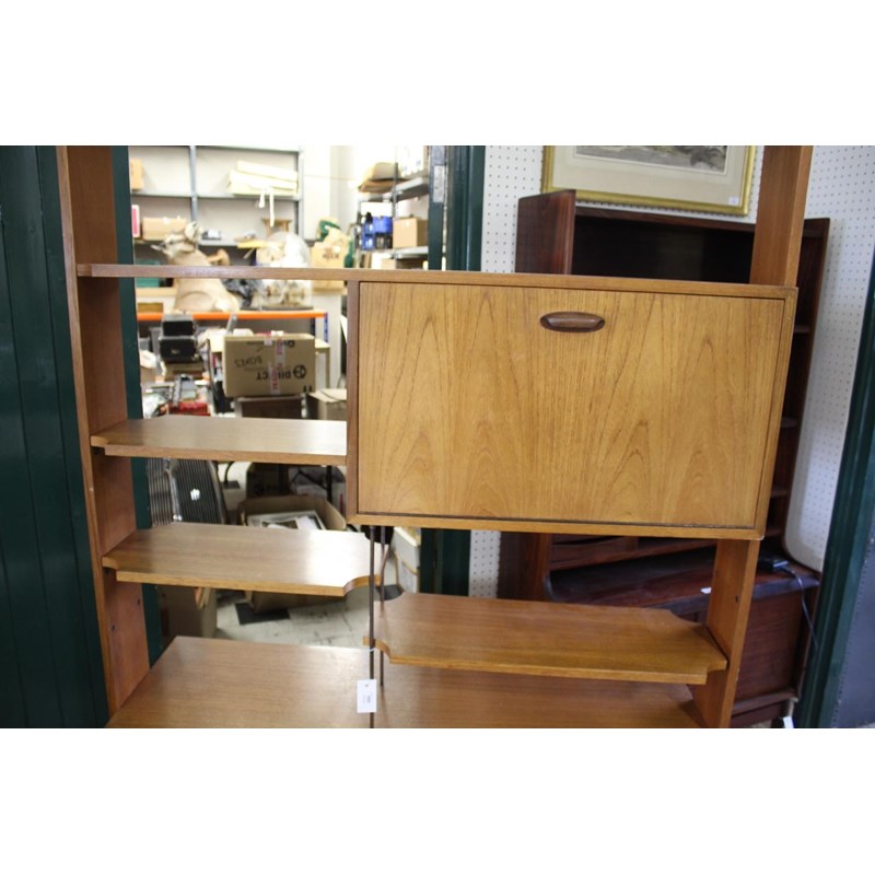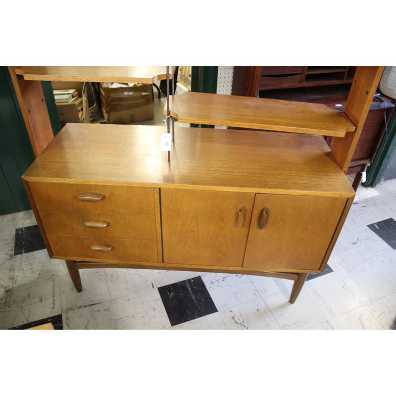 a large teak room divider, the top section with a drop down flap and glass shelf, and various shaped shelves supported on vertical metal supports. The bottom section with a two door cupboard and three drawers, supported on turned legs and cross stretcher. 182cms high, 122cms across