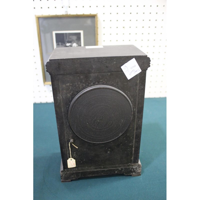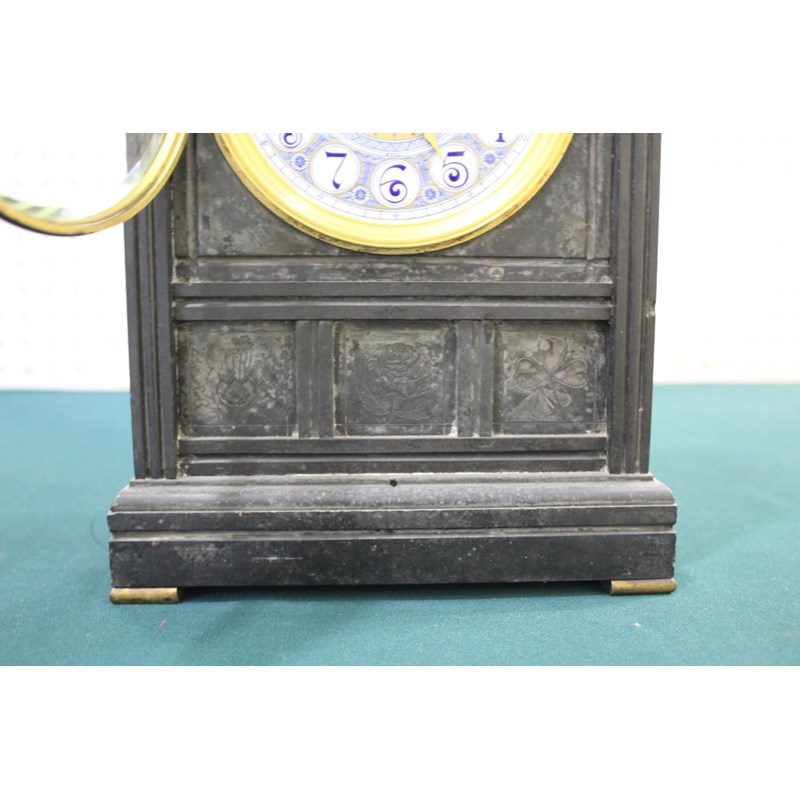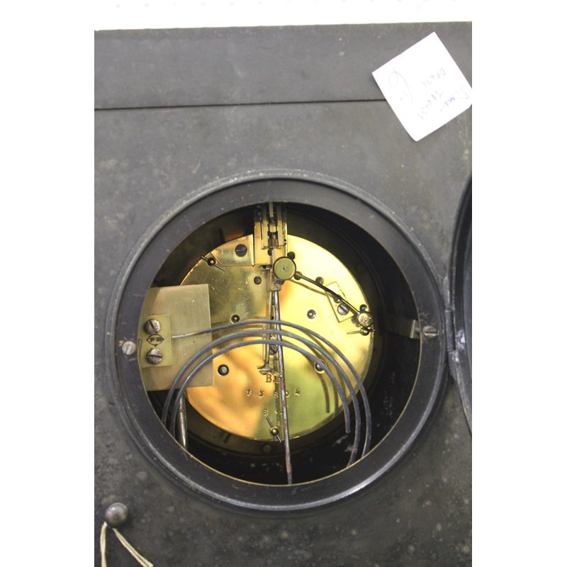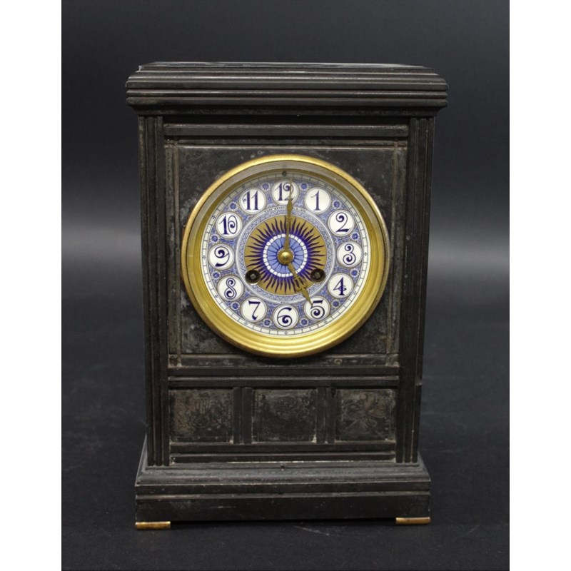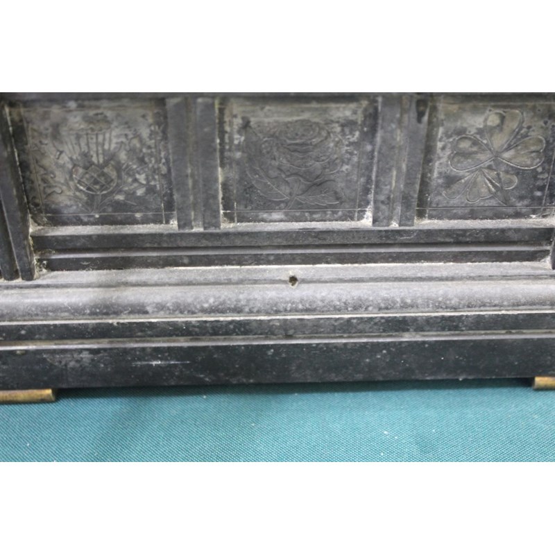 a slate mantle clock with thistle and shamrock motifs, with a pottery dial marked Thos Reynoldson & Son, Hull. Mounted on brass feet, the movement striking on the hours and half hours and marked BR, 13804, 64, with it's pendulum. 30.5cms high
