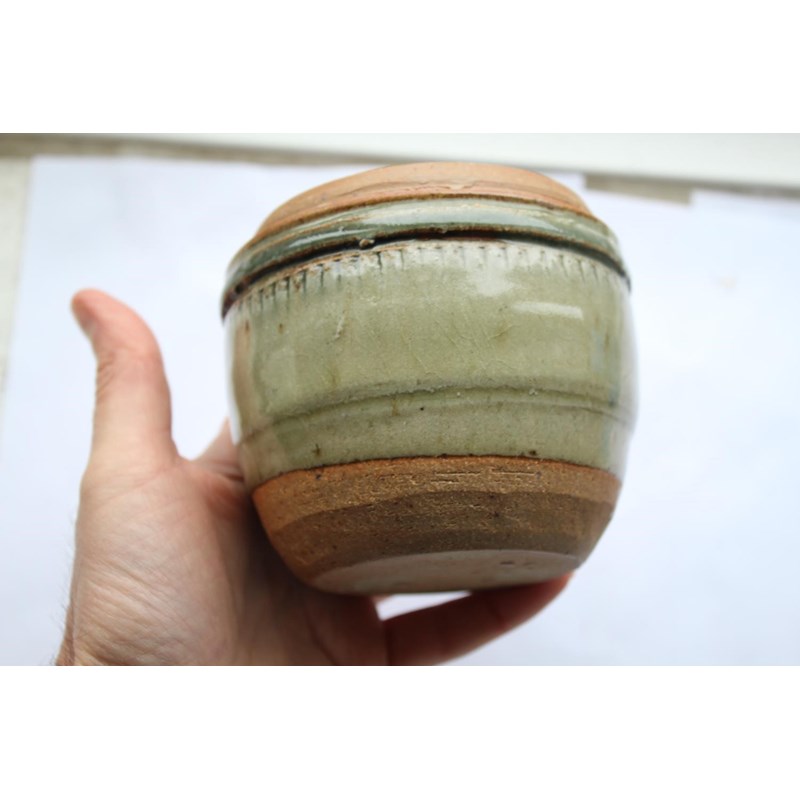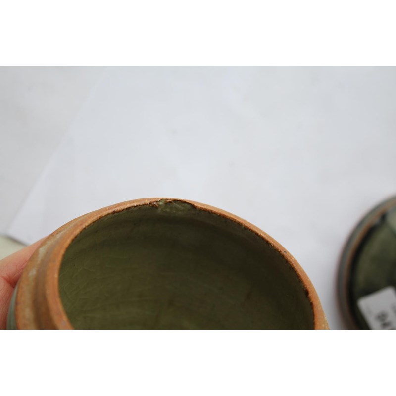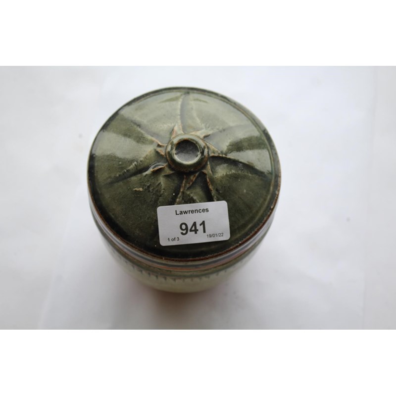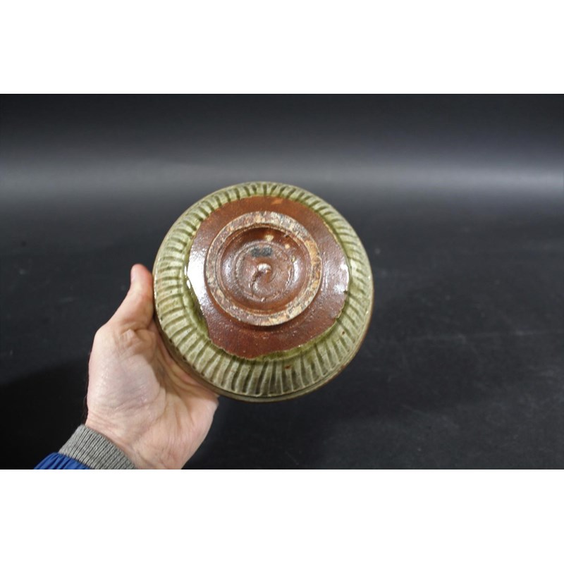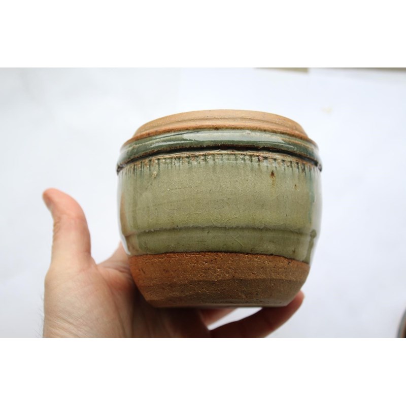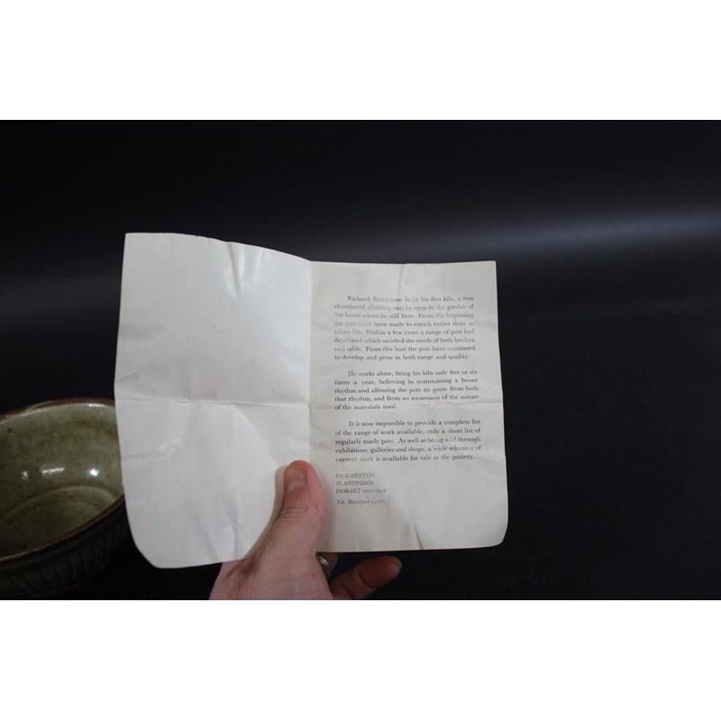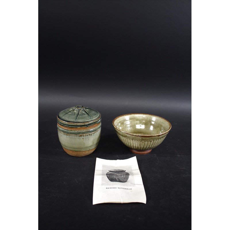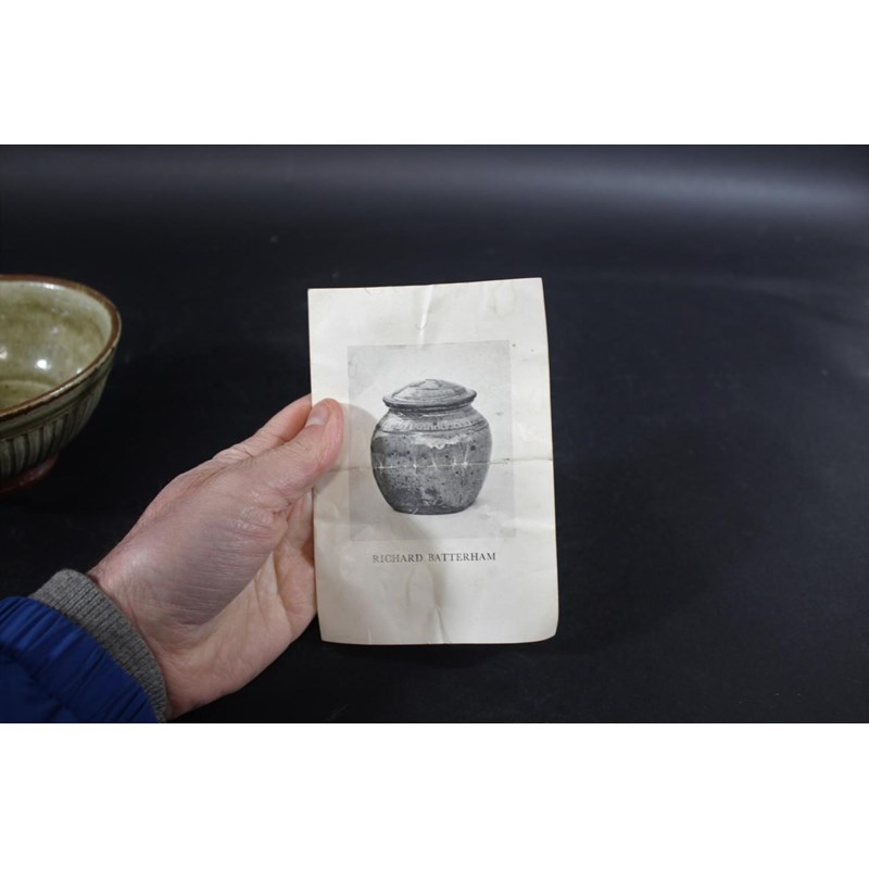 including a green glazed stoneware bowl with grooved sides (15.5cms diameter), a stoneware lidded caddy with a green glaze (12.5cms high), and an old leaflet when he was based in Blandford. (3)