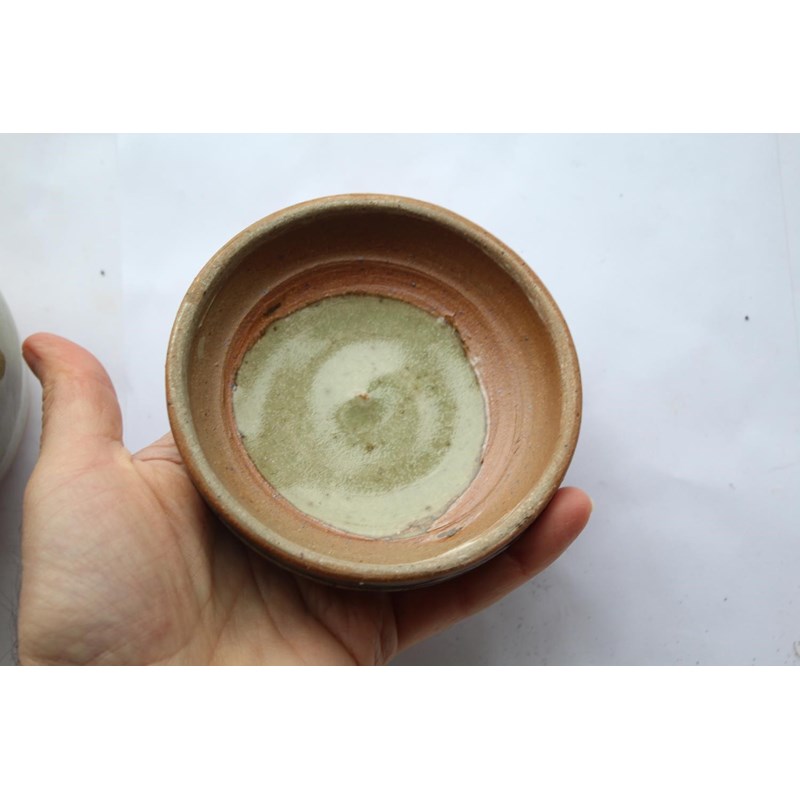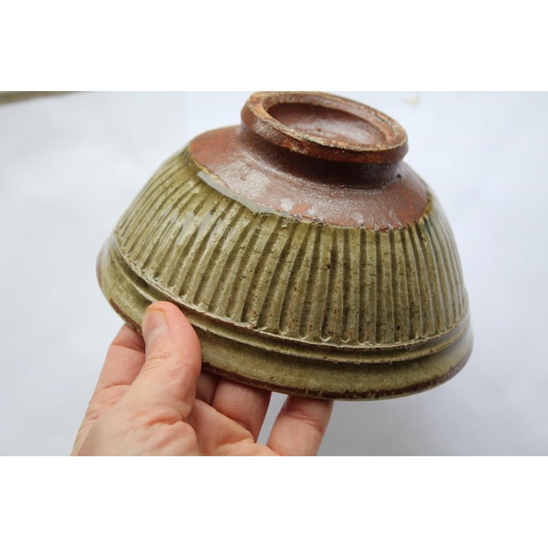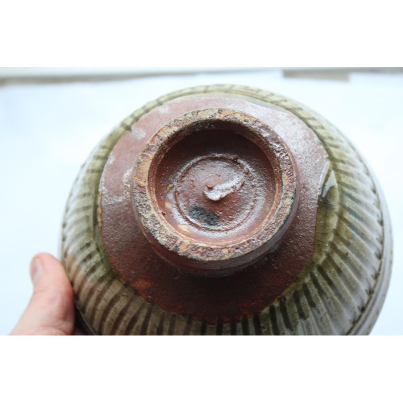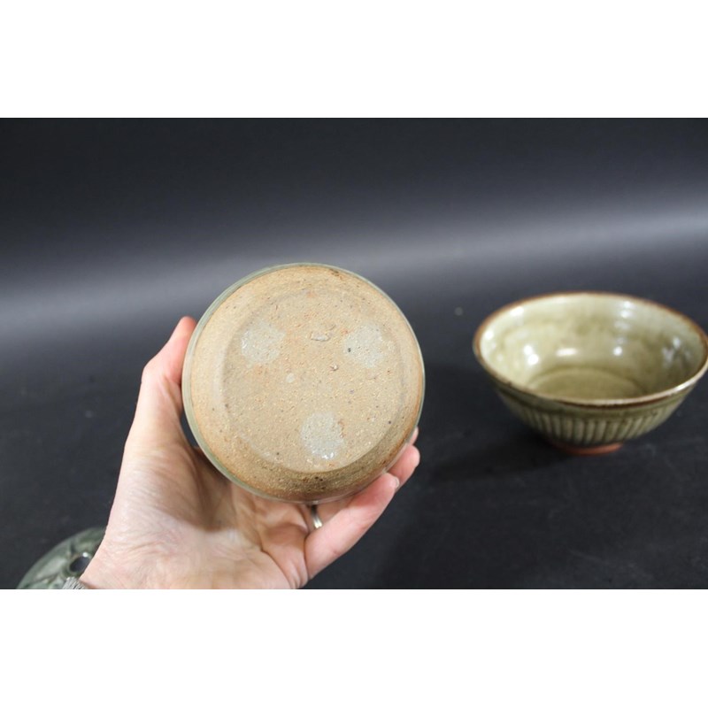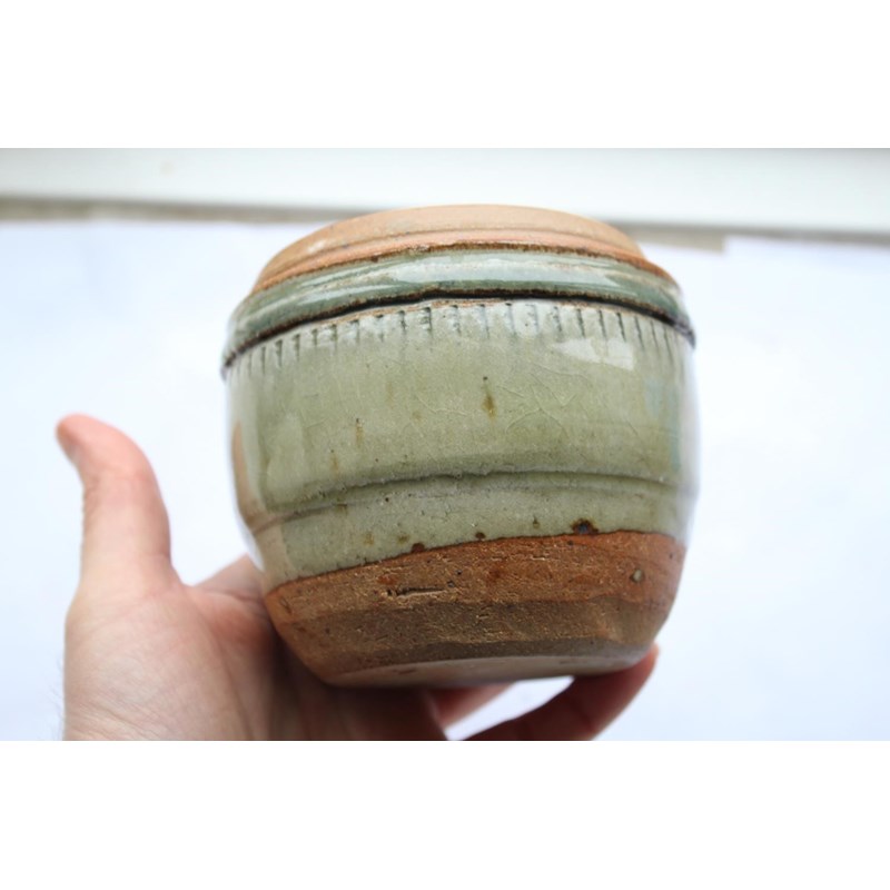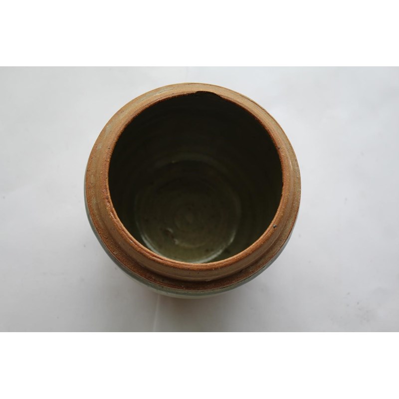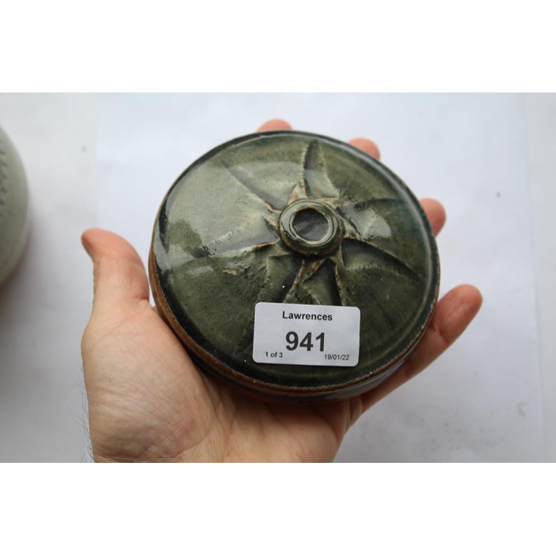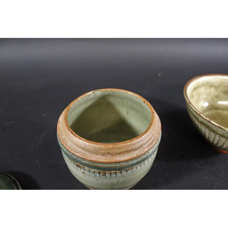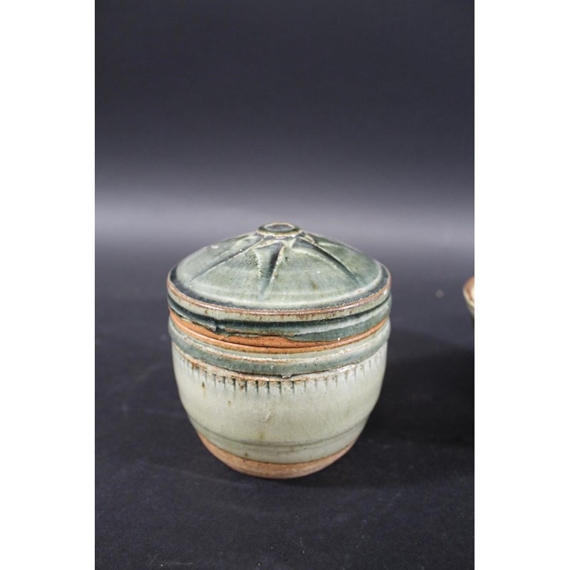 including a green glazed stoneware bowl with grooved sides (15.5cms diameter), a stoneware lidded caddy with a green glaze (12.5cms high), and an old leaflet when he was based in Blandford. (3)