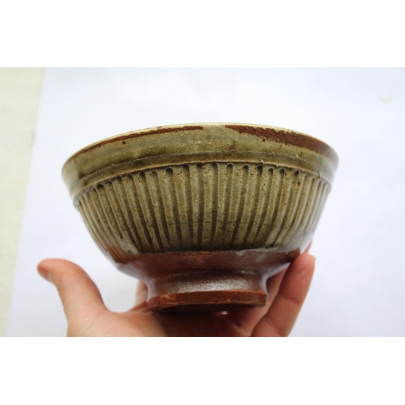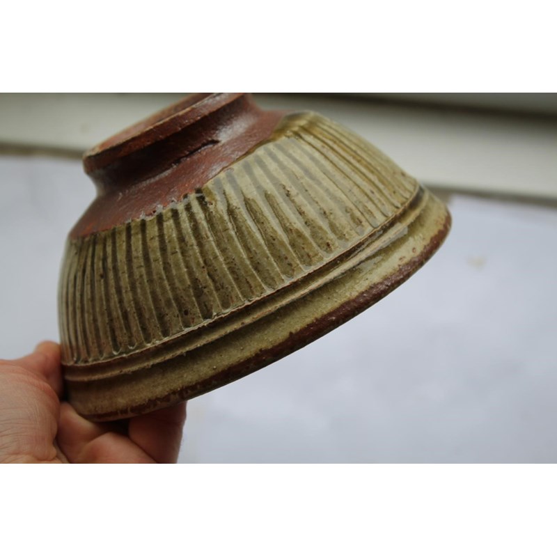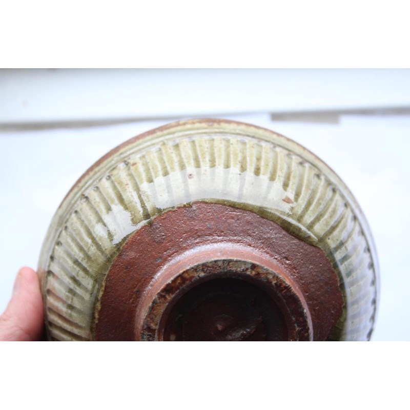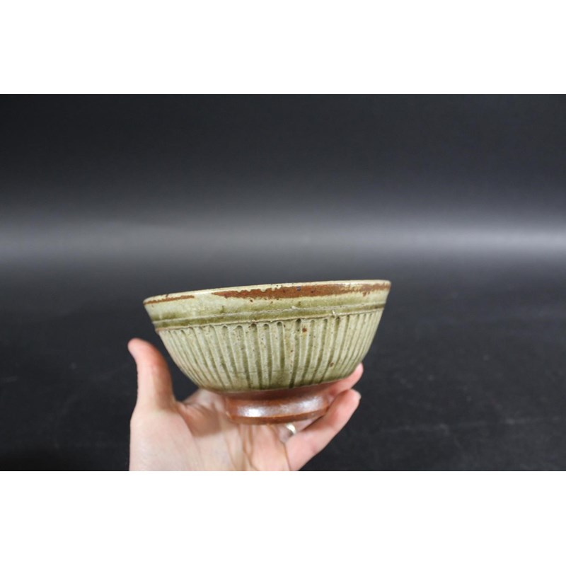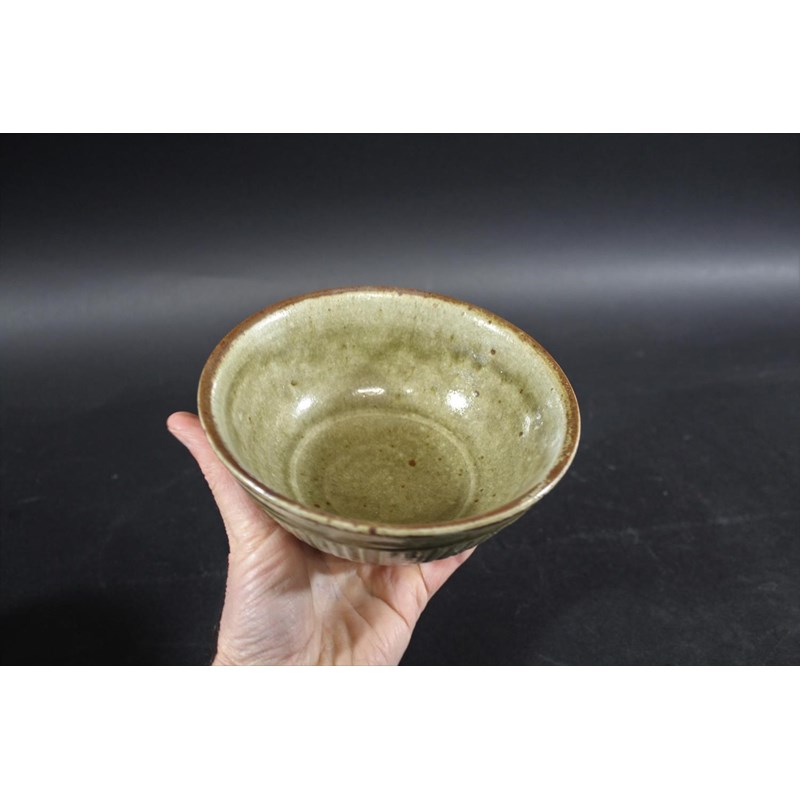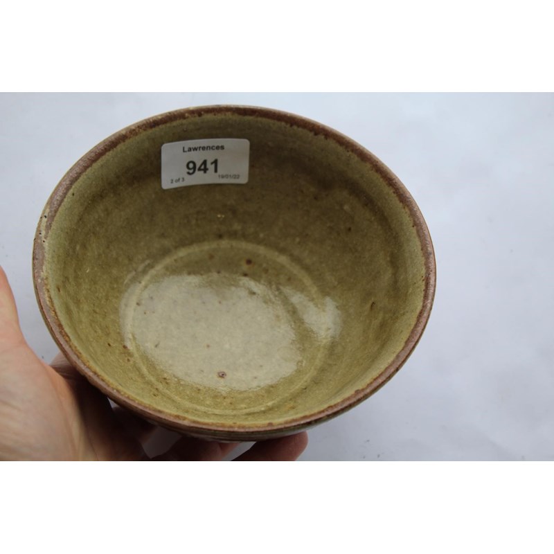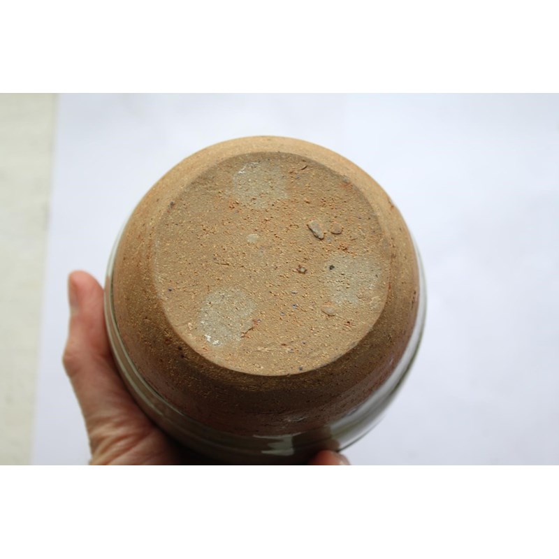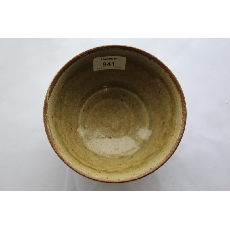 including a green glazed stoneware bowl with grooved sides (15.5cms diameter), a stoneware lidded caddy with a green glaze (12.5cms high), and an old leaflet when he was based in Blandford. (3)