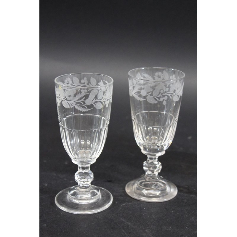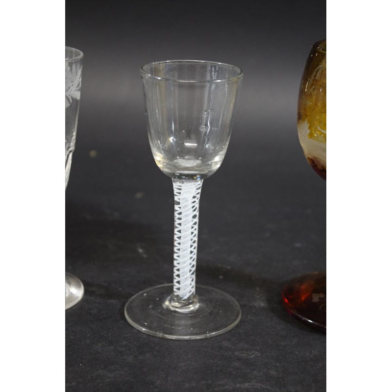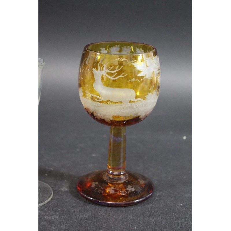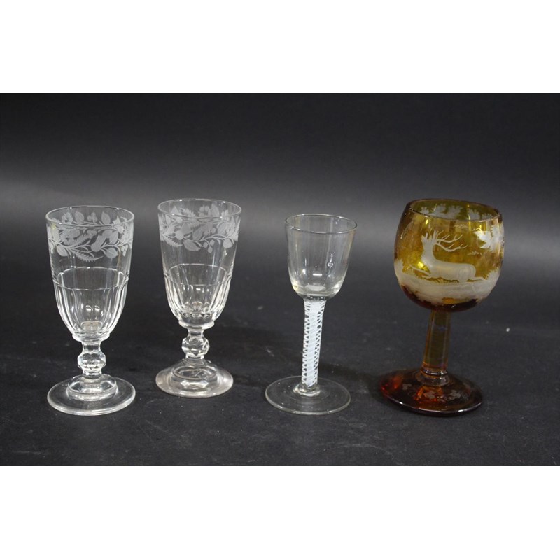 with an ogree shaped plain bowl, with a central cable and pair of spirals, 13.5cms high. Also with a pair of ale glasses engraved with flowers and leaves (13.5cms high), and a Bohemian amber tinted goblet engraved with a stag in a landscape (15cms high). (4)