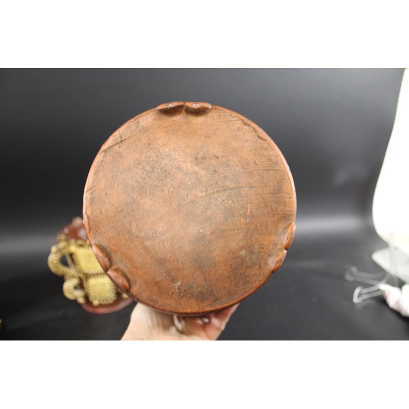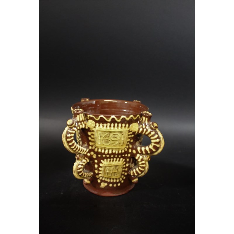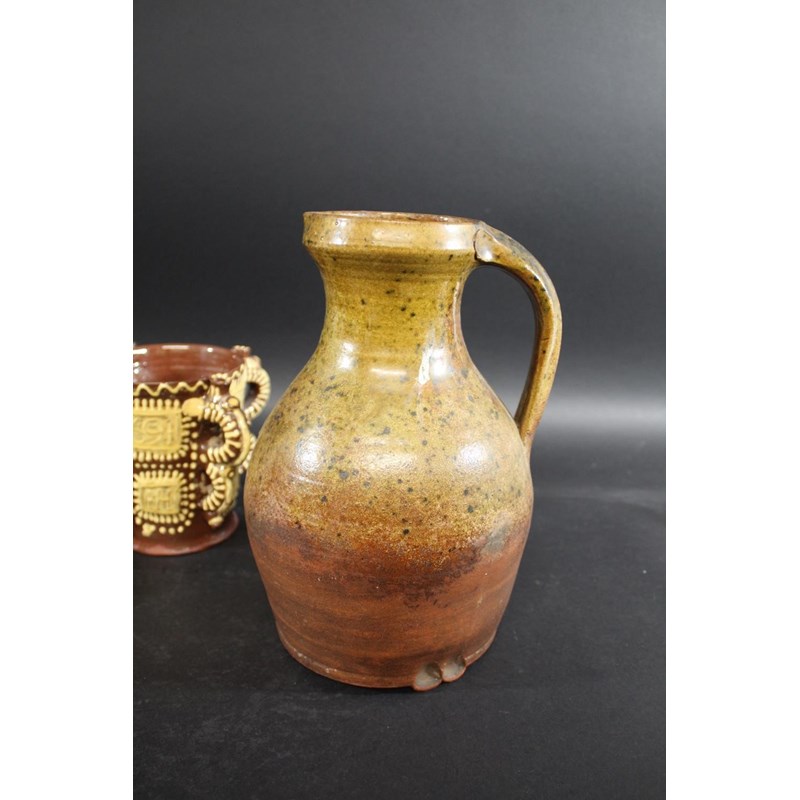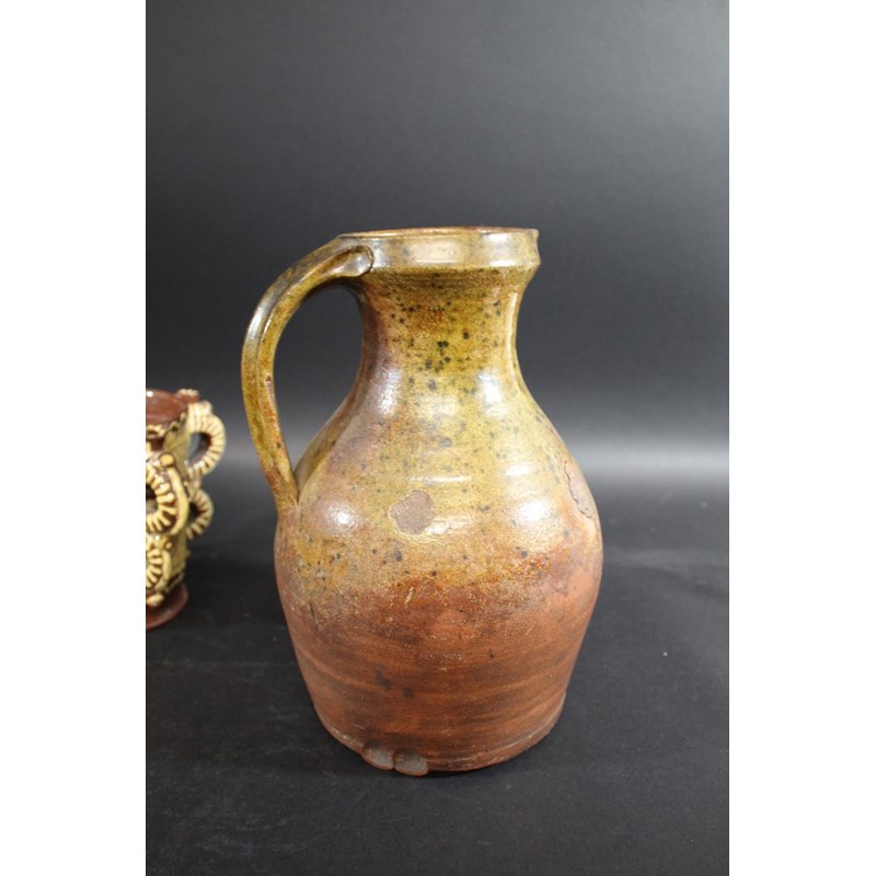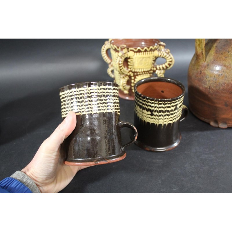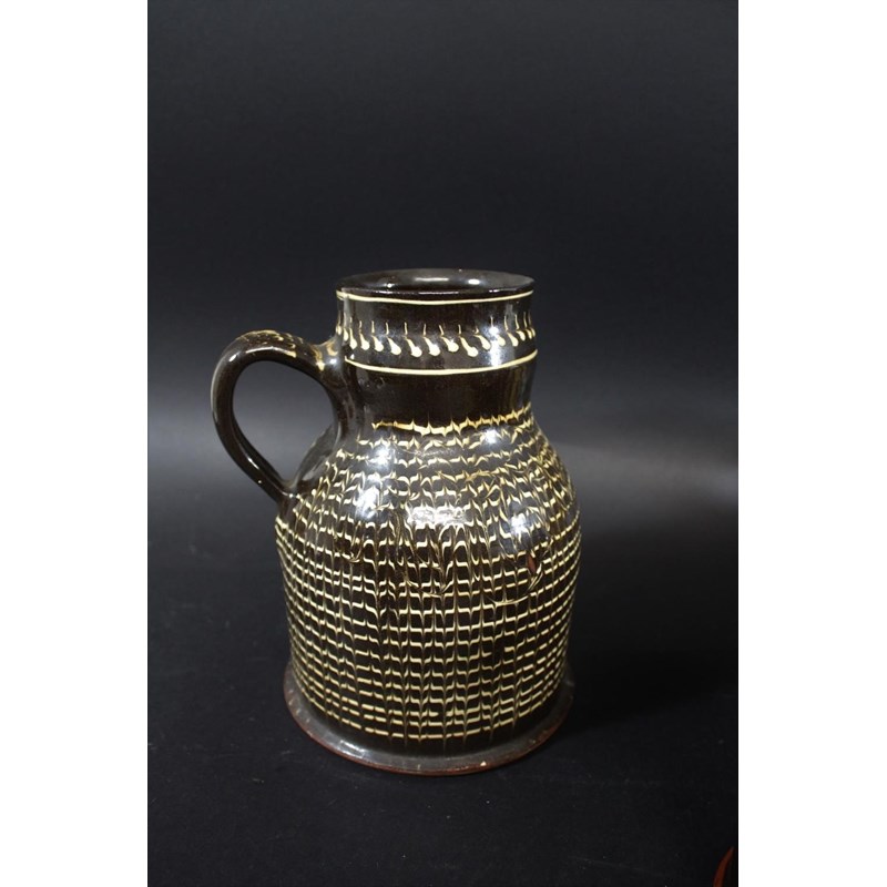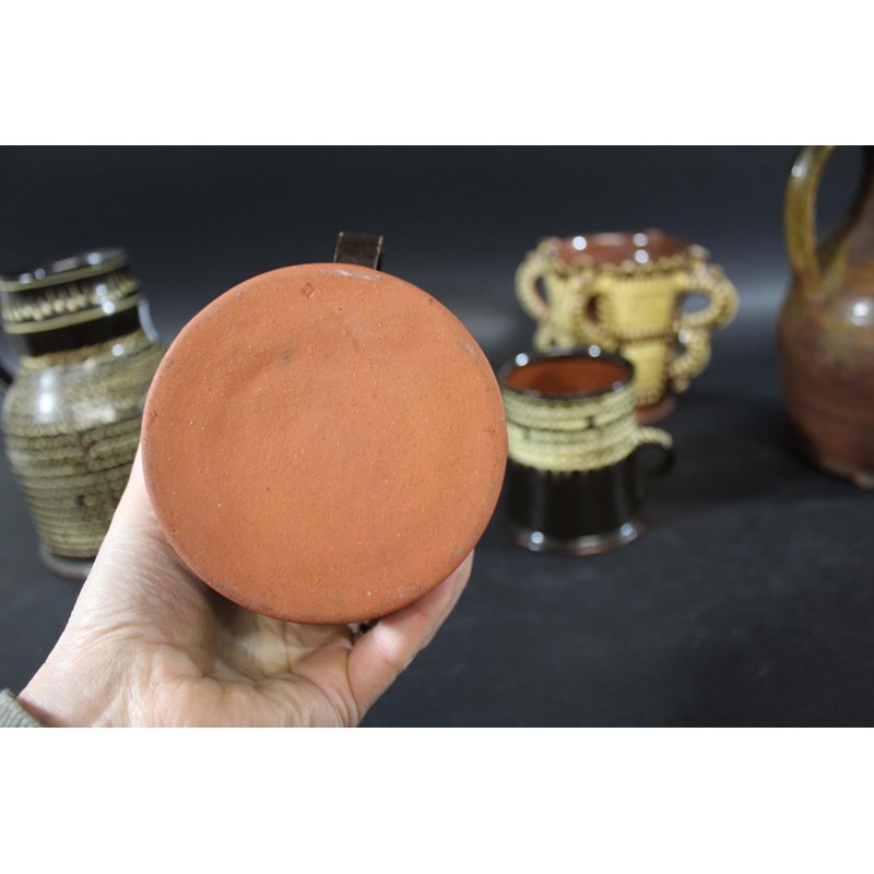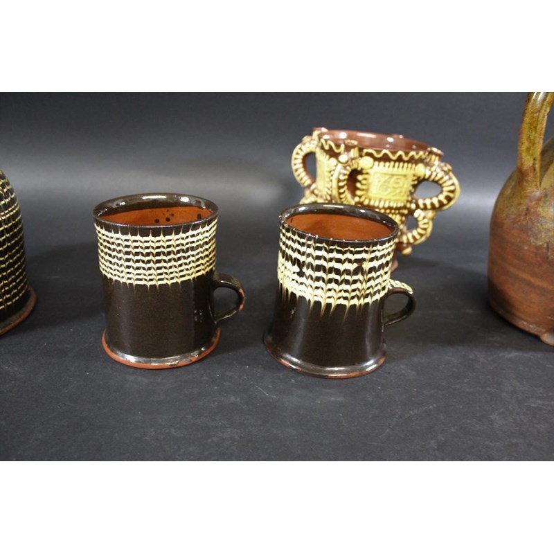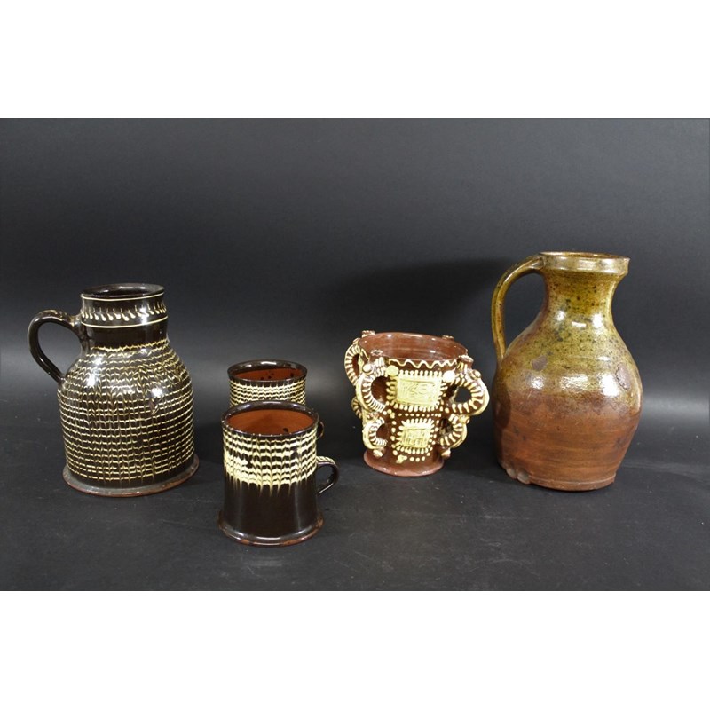 probably 19thc, with trails of yellow slip on a dark brown ground and with a notched rim (33cms diameter). Also with a large slipware jug with white slip on dark brown glaze (22.5cms high), two similar tankards (12cms high), a large medieval style jug (29cms high), and a replica of a slipware posset pot (16cms high). (6)
