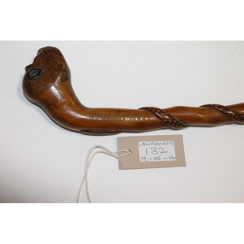A hand carved Horse Whip with Baboon Head pommel and an entwined snake on the 23" shaft. The ear of the Baboon is missing, the inscription carved into the upper part reads thus. Made by a P O W St Helena 1902.