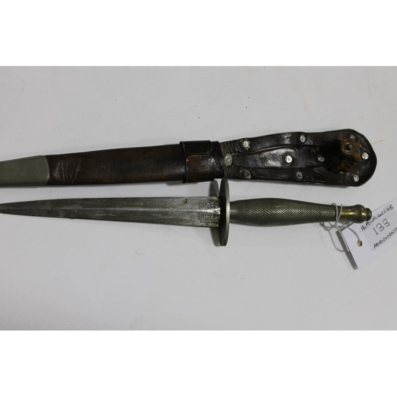 A WILKINSON FS FIGHTING KNIFE. A Fairburn-Sykes fighting knife with Wilkinson on the blade, straight plated quillion and leather scabbard.