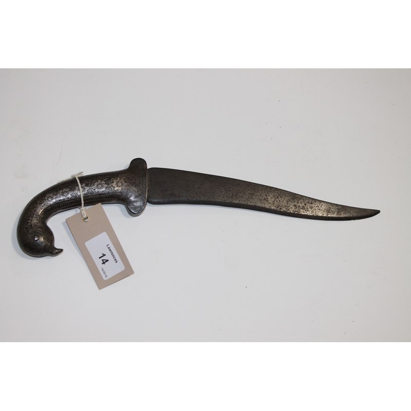 A 19thC stell hilted Khanjar dagger, with birds head pommel and foilage decoration. Yatagan shape single edged blade of 9" in length.