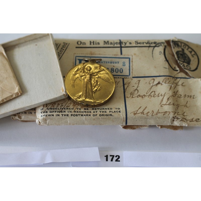 Britisd War & Victory Medals in boxes and packets of issue. Named to 637 Pte E J Jolliffe Dorset Yeo. Addressed to the recipient at Rookery Farm, High Sherborne, Dorset