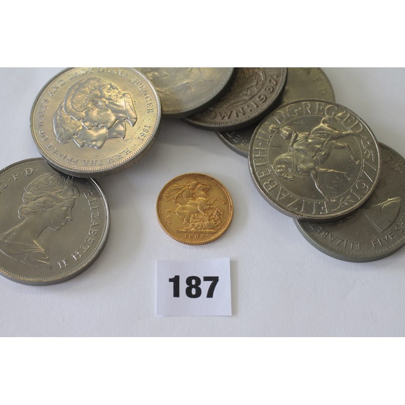 A SOVEREIGN etc. An Edward V11 Sovereign dated 1902 (S) in field, Sidney Mint. A 1937 Crown and other modern crowns, etc.