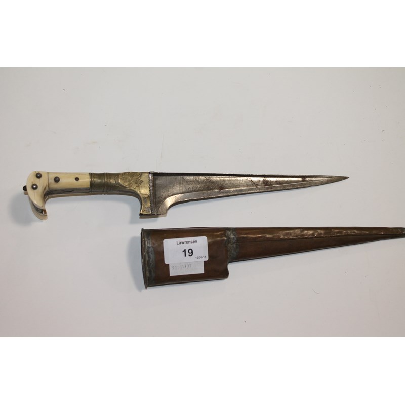 AN INDIAN DAGGER. A Peshkabz Indian dagger with 7.1/2" blade in T section form, lightly decorated. Bone hilt with copper covered scabbard.