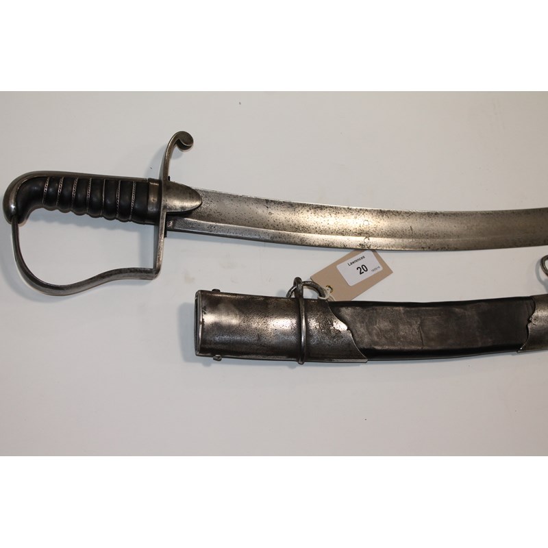 A 1796 Variant Sword in the Light Cavalry style, with steel mounted scabbard. The clean short 1796 blade of 28" in length, has no visible markings. The grip has been rebound and has a shaped backstrap, like the hilt in steel. The scabbard has also been refurbished, making an interesting variant or private purchase sword.