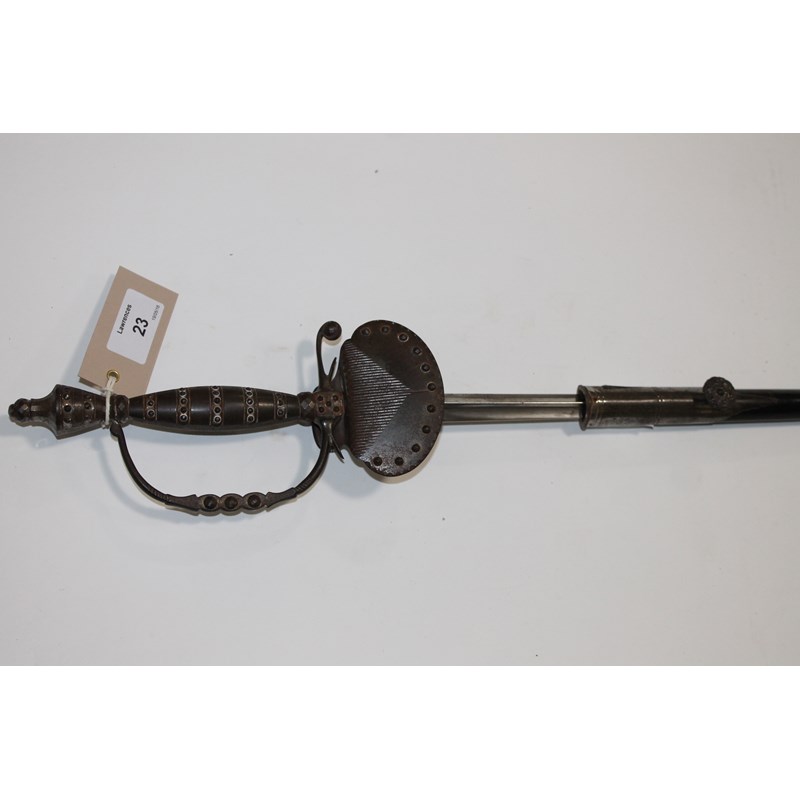 A Court or Official wear sword, complete with steel mounted leather scabbard. Cut steel hilt with shell guards, rapier style 32.1/4" very clean blade.