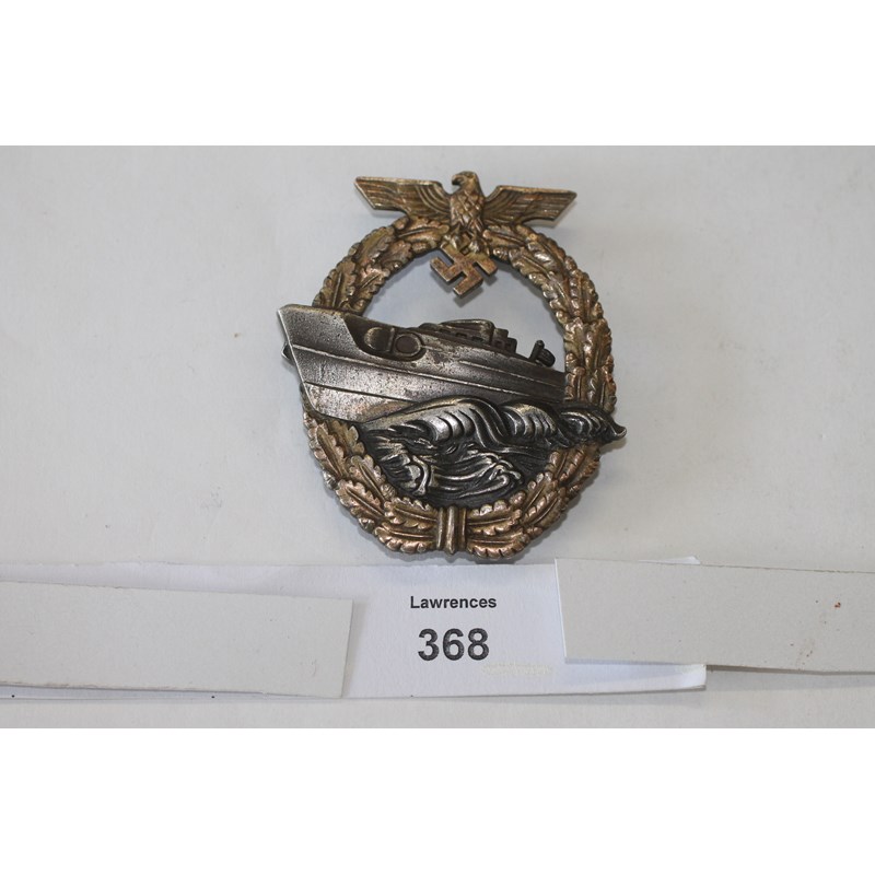 AN E BOAT BADGE. A German U Boat badge with horizontal pinback fixing, makers mark FEC. W. E. PEEKHAUS AUSF SCHEWERIN. BERLIN. 68.