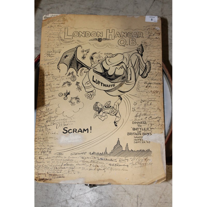 A London Hangar Q B, Dinner to the Battle of Britain Boys at the Savoy Hotel, signed by many participants and famous names. Over 100 signatures including Billy Clyde 601 Sqdn an 'Ace'. Anthony Bartley 111 Sqdn (12 kills). Dennis Crowley-Milling, Hugh Dowding, Max Aitken, M C Loudon, Basil Embry, etc. Centre sketch signed Struple, with Goering getting his backside kicked. The numbered signatures are presumably a key to a separate listing of participants at the dinner.