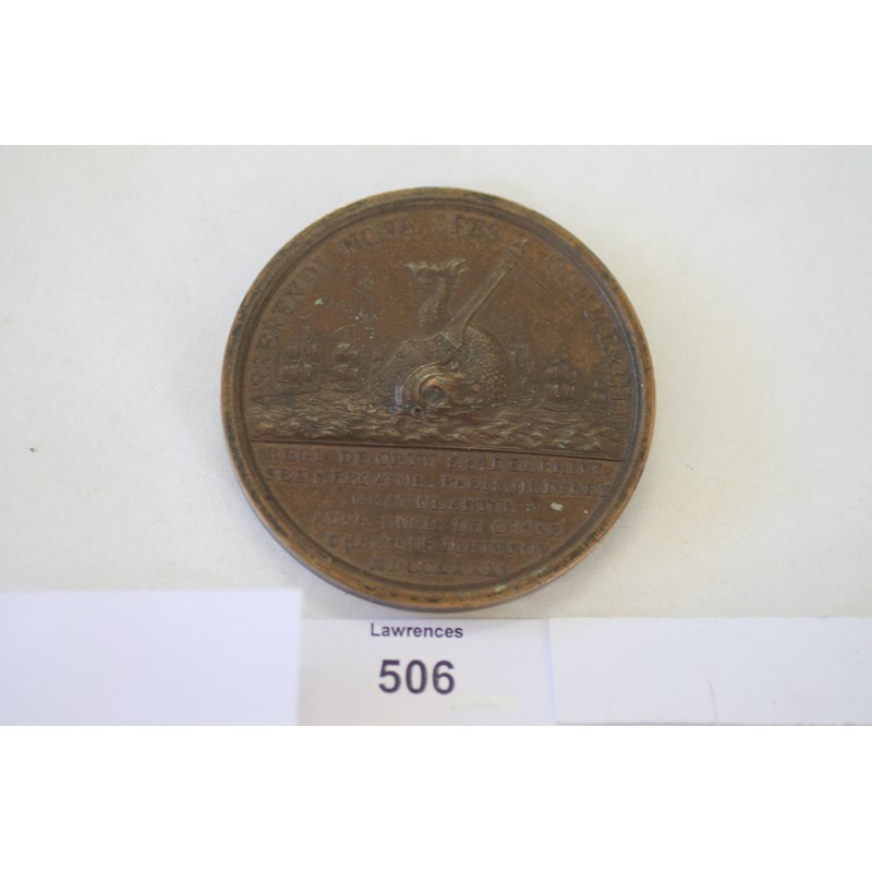 A 60mm diameter medallion, with the facing busts of Louis XV1 and Marie Antoinette, by the designer J Duvivier The obverse legend reads, LUD .XV1.FR. ET. NAV. REX. MAR. ANT. AUSTR. REG.. The reverse legend with shipping in the reads, ASSERENDI NOVA SPES COMMERCII. Regi de Orto SS Delphini Sex Mercator. Paris. Ordines Gratulantur Ausp Ducis De Cosse. Urbis Gub. Die 1V Nov MDCCLXXX1.