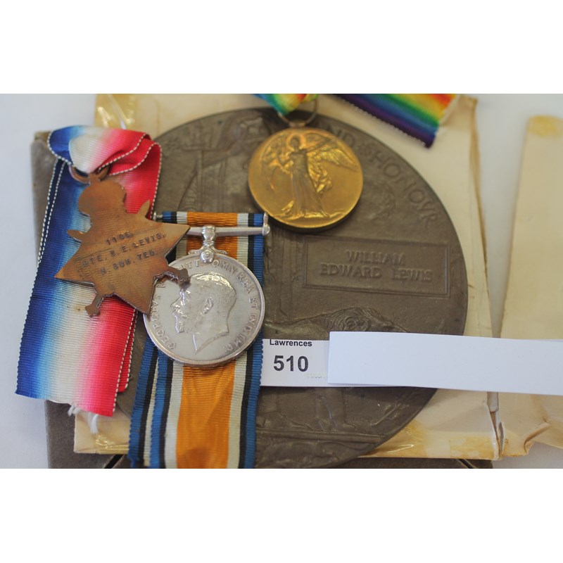 A 1914/15 Star named to 1188 Pte W E Lewis N Som Yeo. British War Medal named to 1188 Pte W E Lewis N Som Yeo (Erased Victory Medal).. Death Plaque named to William Edward Lewis, with card box of issue and Kings Letter.