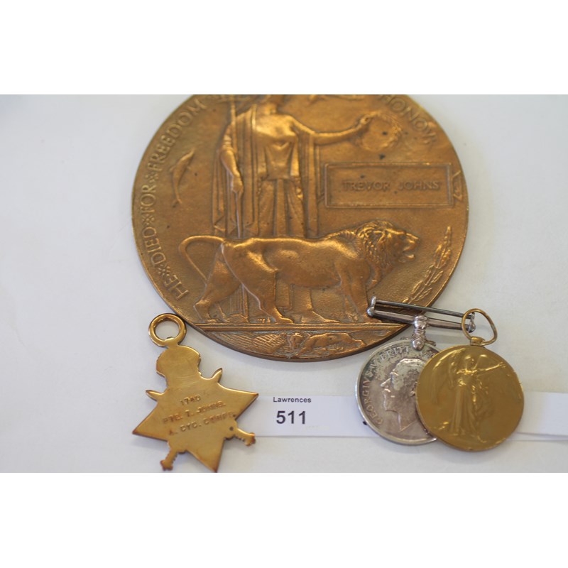 A 1914/15 Star named to 1740 Pte T Johns A Cyc Corps. British War & Victory Medals named to 1740 Sjt T Johns A. Cyc. Corps. Death Plaque named to Trevor Johns.