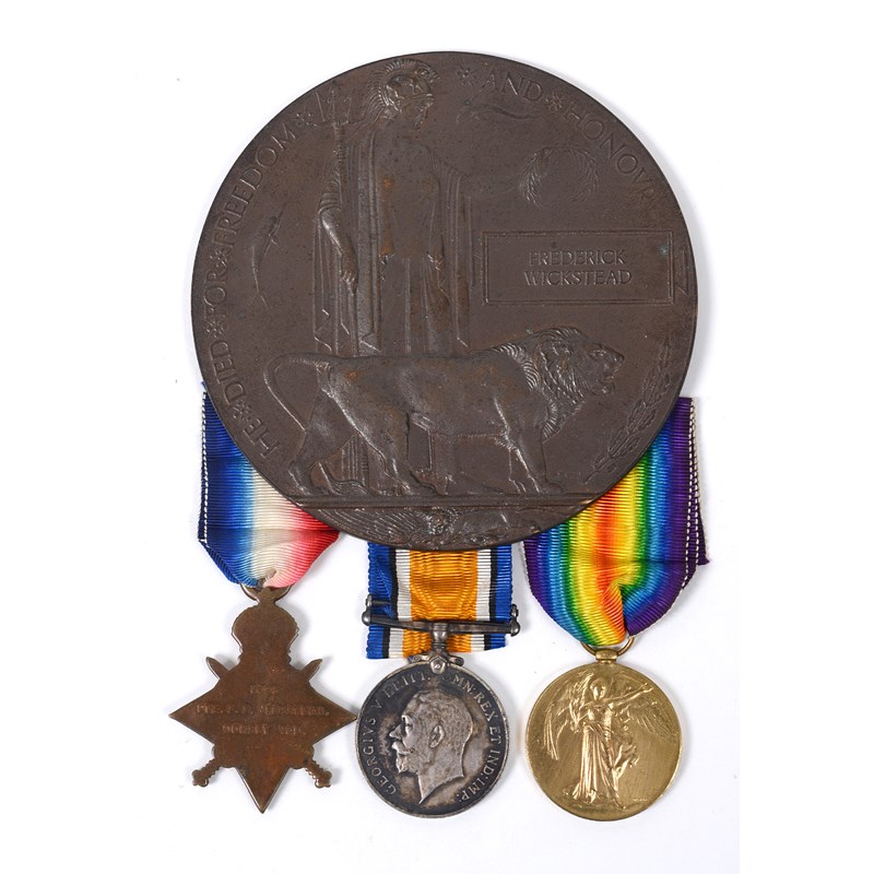 A 1914/15 Star, British War & Victory Medals named to 1496 Pte F C Wickstead Dorset Yeo. A Death Plaque named to Frederick Wickstead.