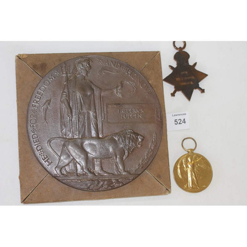 A 1914/15 Star & Victory Medal named to 8408 Pte F Budden Dorset R. A Gt War Memorial Plaque named to Frederick Budden. Also a Victory Medal named to 67199 Pte C H Budden Worcs Regt.