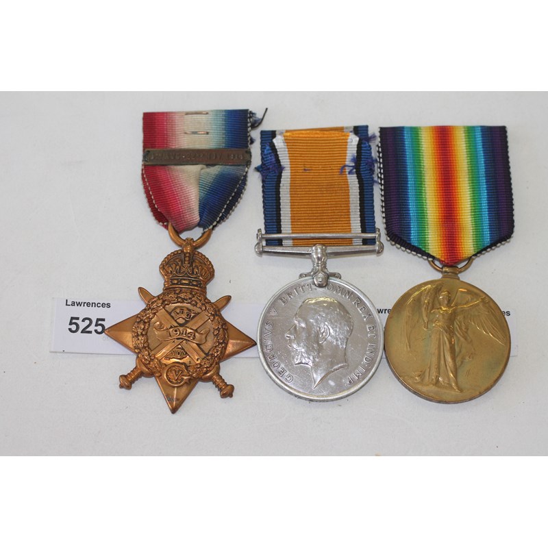 1914 Star with clasp, British War & Victory Medals, named to 14392 Pte A H Mole Gren Gds.