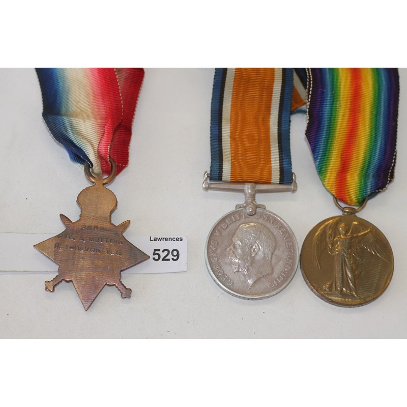 A 1914/15 Star named to 2512 Pte S Mutton.R. 1-Devon Yeo. British War & Victory Medals named to 2512 Pte S Mutton R. 1-Devon Yeo.