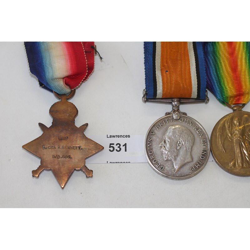 A 1914 Star with Aug-Nov clasp, British War & Victory Medals named to 6128 L/Cpl H Bennett 5/D-Gds.