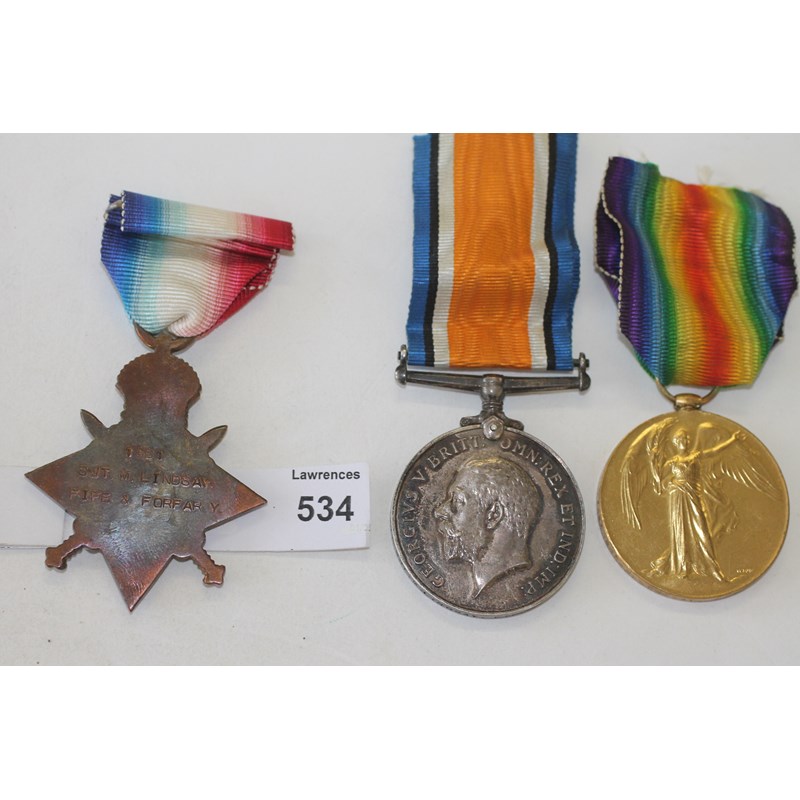 1914/15 Star, British War & Victory Medals named to 1391 Sjt M Lindsay. Fife & Forfar Y.