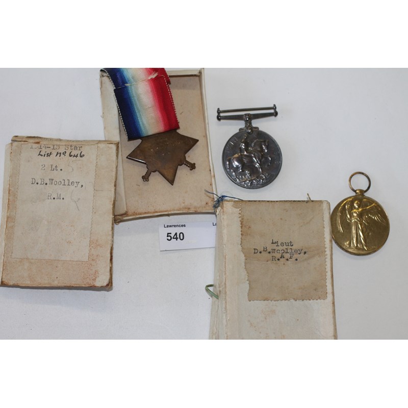 A 1914/15 Star in box of issue awarded to 2/Lt D B Wooley R .M. British War & Victory Medals in boxes of issue, awarded to Lt D B Woolley RAF.