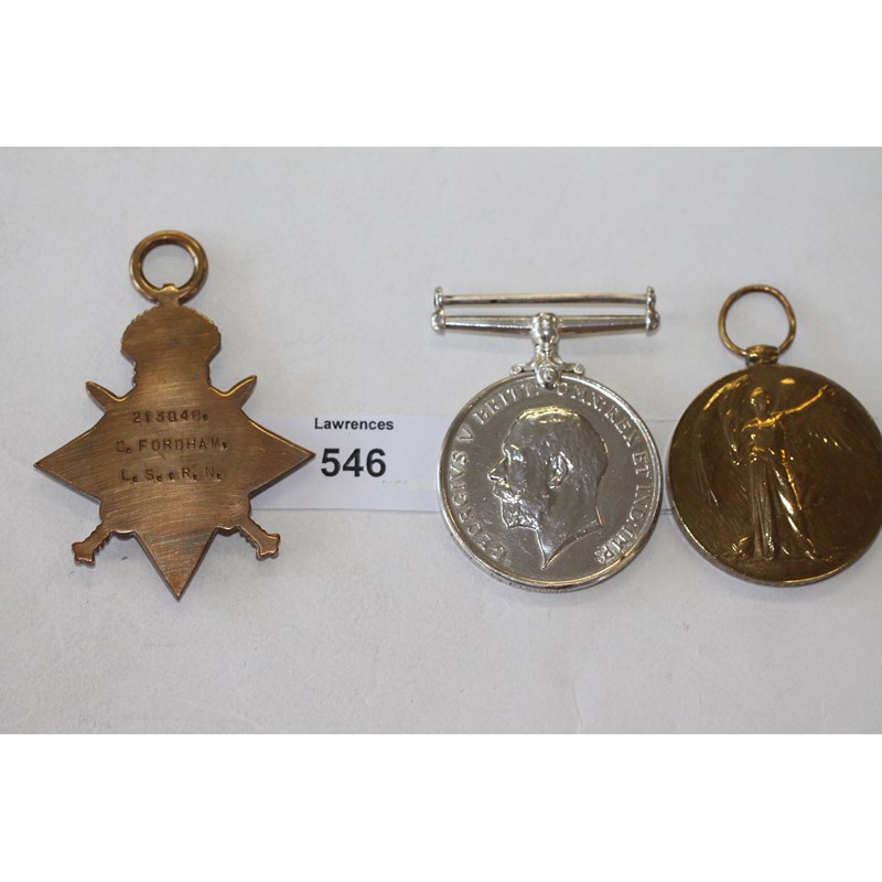 A ROYAL NAVY GT WAR TRIO. A 1914/15 Star named to 213048 C Fordham L.S.R.N. British War & Victory Medals named to 213048 C Fordham A.B. R.N Confirmed as a Trio by Royal Navy Rolls.