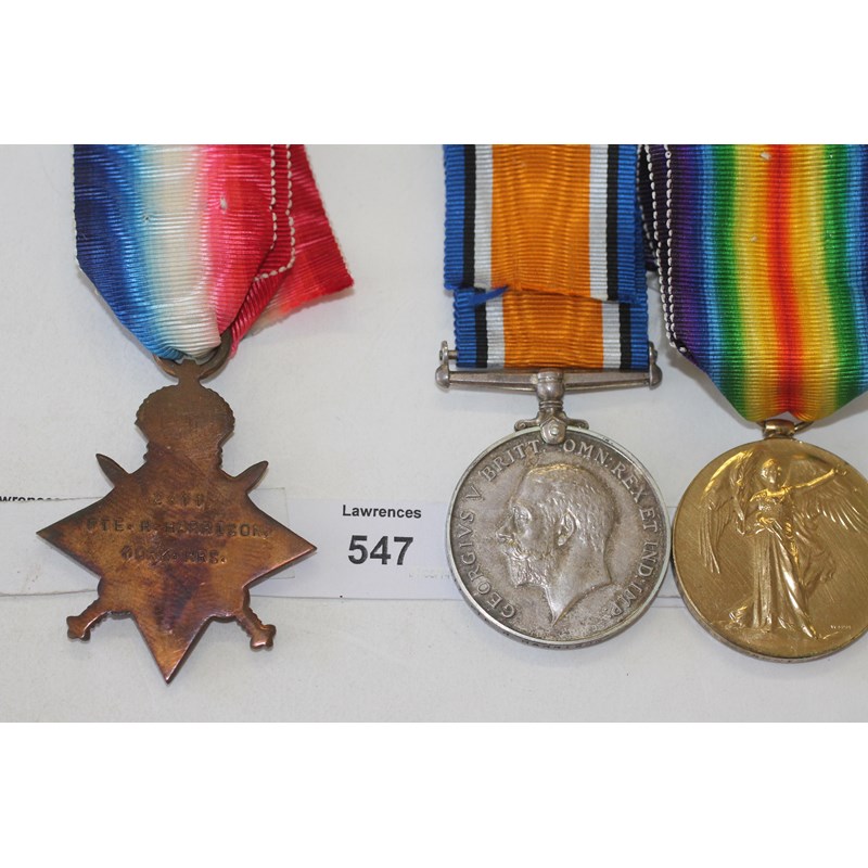 A 1914/15 Star, British War & Victory Medals named to 2411 Pte R Harrison Yorks Hrs.