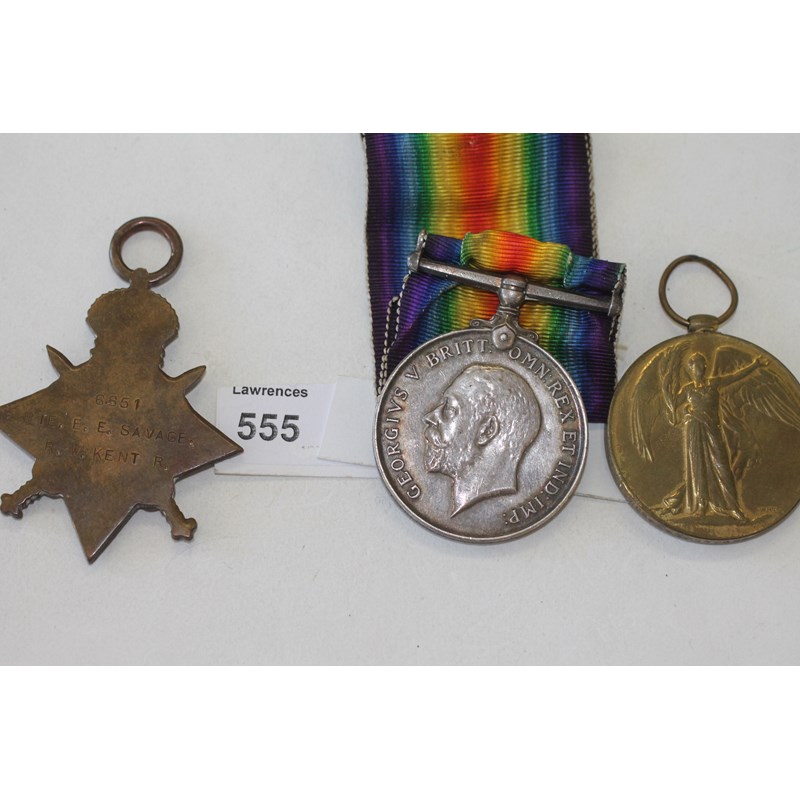 1914/15 Star, British War & Victory Medals named to 6851 Pte E E Savage R W Kent R.