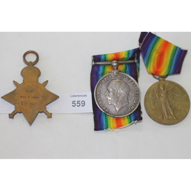 A 1914/15 Star named to 10386 Pte F Sharp L N Lan.R. British War & Victory Medals named to 10386 A/Cpl F Sharp L.N.Lan.R.