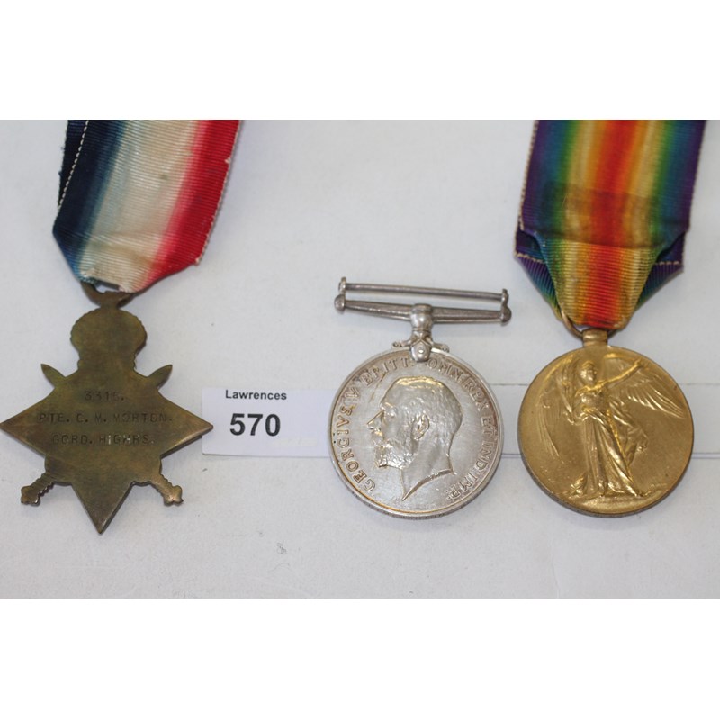 A 1914/15 Star named to 3315 Pte C M Morton Gord. Highrs. British War & Victory Medals named to 3315 Pte C M Morton Gordons.