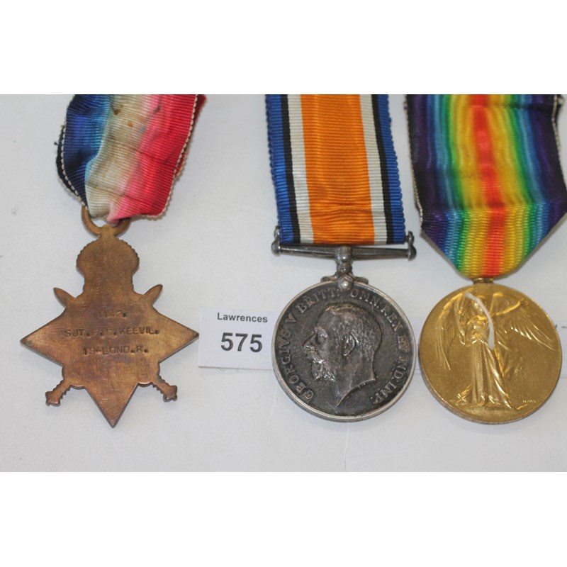 A 1914/15 Star, British War & Victory Medals named to 1142 Sjt F C Keevil 19 Lond.R.