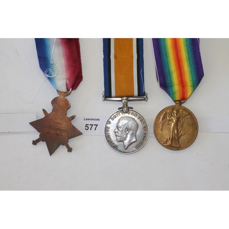 A 1914/15 Star, British War & Victory Medal named to 1774 Pte E J Cotton 22 Lond R.