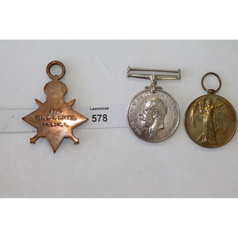 A 1914/15 Star, British War & VIctory Medals named to 2705 Pte C R Carvil 24- Lond R.