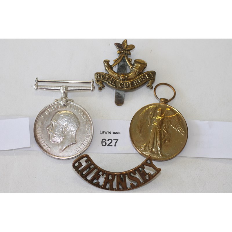 British War & Victory Medals named to 3907 Pte F E Auger R.Guernsey L I. Also Pte (Frank Augers) Royal Guernsey Cap Badge and Shoulder Title.