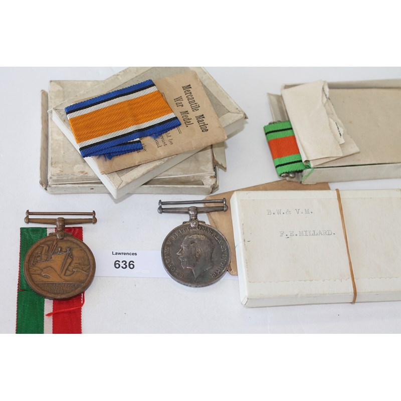 A British War Medal and Mercantile Marine Medal, both named to James E Wren. A Defence Medal unnamed as issued, awarded to James E Wren.